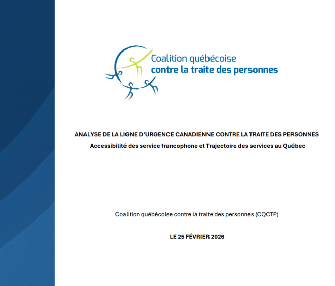 Dans le cadre du renouvellement de la Stratégie canadienne contre la traite des personnes (2025-2029), la CQCTP présente une analyse de la Ligne d'urgence canadienne contre la traite des personnes qui met en lumière des lacunes importantes quant à l’accessibilité des services en français et à la trajectoire des services au Québec.